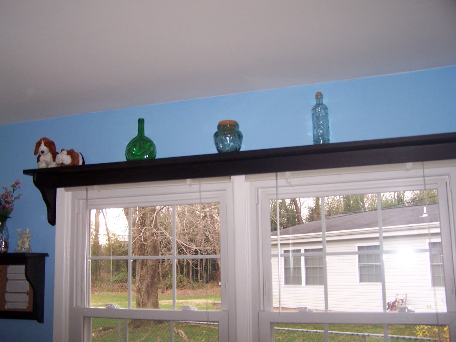 Mike built a shelf above her windows years ago. It was originally white. So we pulled that down and Kristin painted it black. She likes glass bottles, so she's been keeping her eyes out for different ones. These bottles have been found at various yard sales. The empty space on the right is about to have a neat project on display. I'll share that tomorrow in the final installment.